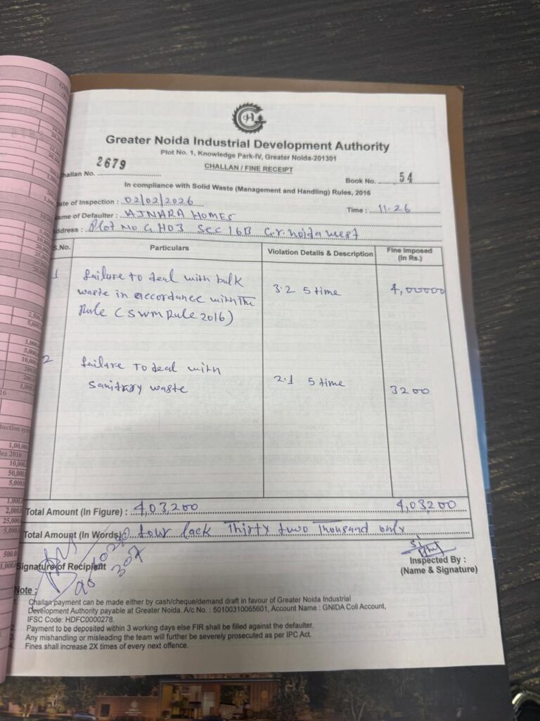 Considering the gravity of the violation, the authority imposed a fine of ₹50 crore on Ajnara Society. In addition, the health department levied an extra penalty of ₹4 crore for non-compliance with bulk waste generator rules, taking the total fine to ₹54 crore.