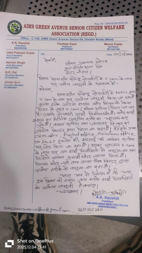 In a formal complaint submitted by the Aims Green Avenue Senior Citizen Welfare Association, residents have made serious allegations against the builder and Noida Power Company Limited.