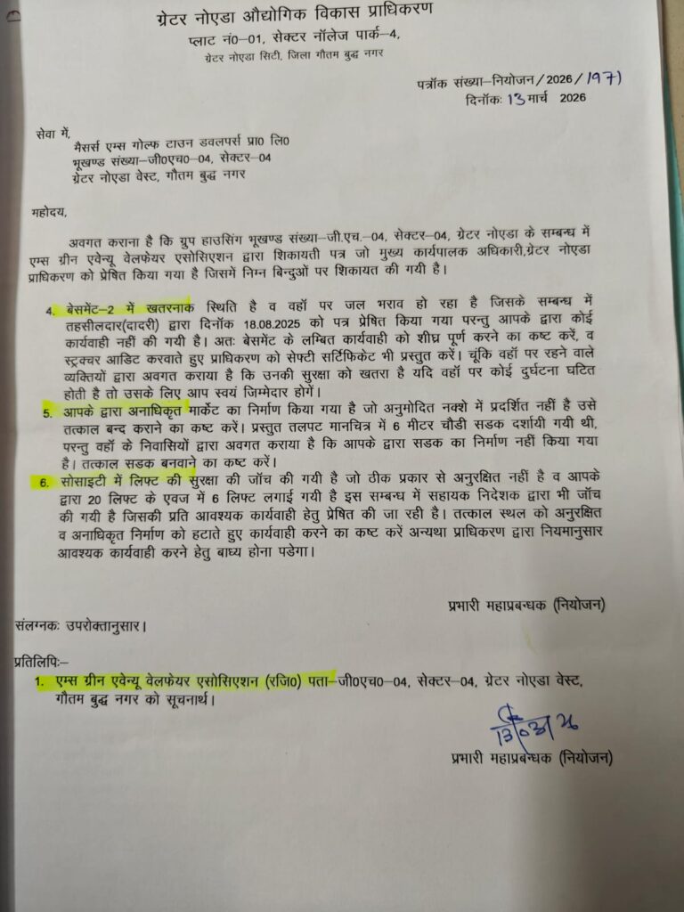 An official communication from the Greater Noida Industrial Development Authority dated March 13, 2026, confirms that Basement-2 is in a hazardous condition due to continuous waterlogging. Residents had earlier raised complaints, but no corrective action was taken. The authority has warned that structural safety is at risk and held the builder accountable for any accident.