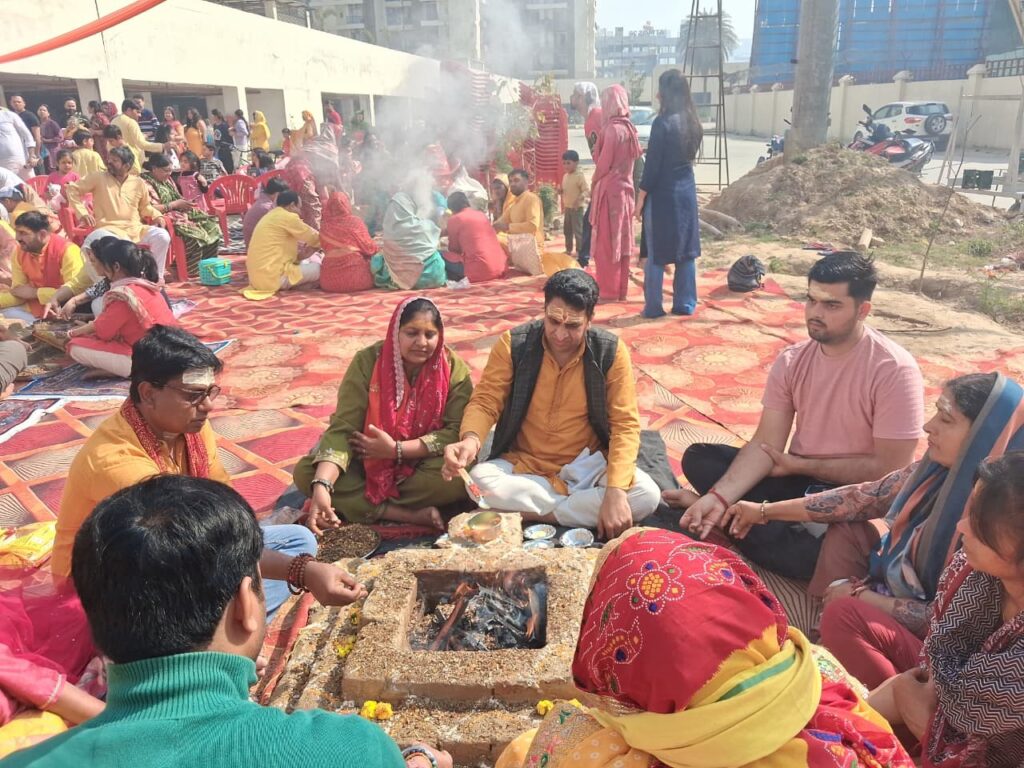 At 10:15 am, a five-kund havan was conducted with elaborate Vedic rituals. Priests performed the ceremony with precise mantra recitations, praying for universal welfare, prosperity, harmony and good health for all. The sacred fire ritual drew active participation from families across both societies. Following the havan, prasad was distributed among devotees, symbolising blessings and divine grace.