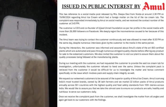 Amul posted on Twitter that on June 15, 2024, Smt. Deepa Devi, a resident of Noida, complained on social media about seeing an unknown thing on the lid of an Amul ice cream box. Amul responded immediately and at 3:43 pm they got the customer’s number. Deepa is the CEO of Ujjwal Unnati Foundation and has more than 26,000 Facebook followers. Amul expressed regret for the incident. They were constantly trying to contact her. At 9:30 pm, permission was granted to meet her. In the conversation, Amul talked about its ISO-certified plants and quality processes. He also invited Mrs. Deepa to visit the plant.