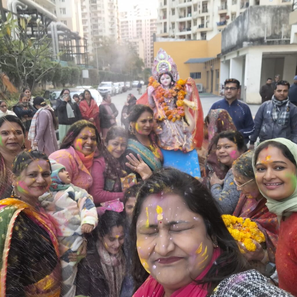 The celebrations began on January 23 at 11 am with the ceremonial installation of Goddess Saraswati’s idol at the society temple. The temple and all deities were beautifully decorated with colourful flowers, creating a serene and devotional atmosphere. Following the installation, a community khichdi bhandara was organized at the main gate in the afternoon, where a large number of residents participated, reflecting unity and harmony within the society.
