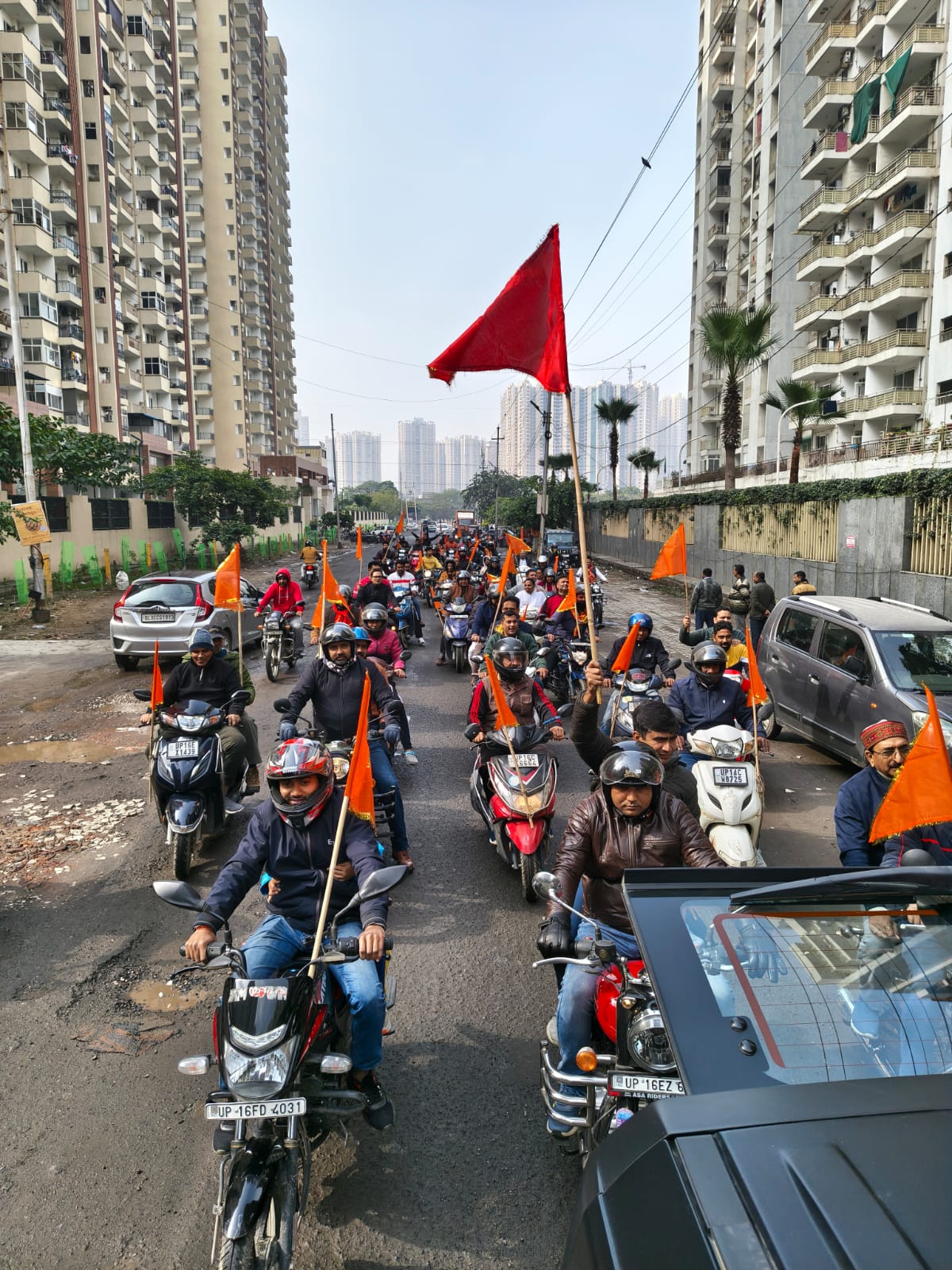 Greater Noida : An awareness bike rally was successfully organised in Greater Noida on Sunday to build public awareness ahead of the Vishal Hindu Sammelan scheduled for February 8. The Hindu Sammelan Jagran Bike Rally began at 10 am from a location between Tikona Park, Nirala Estate and Spring Meadows.