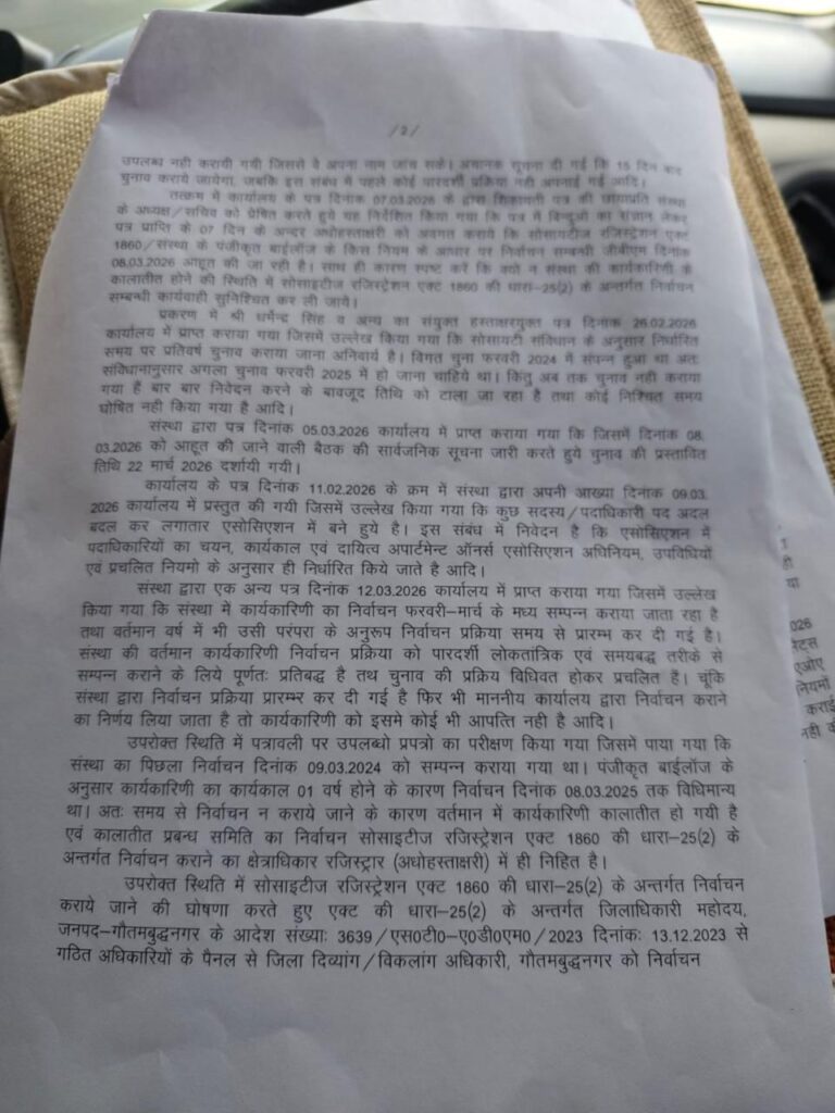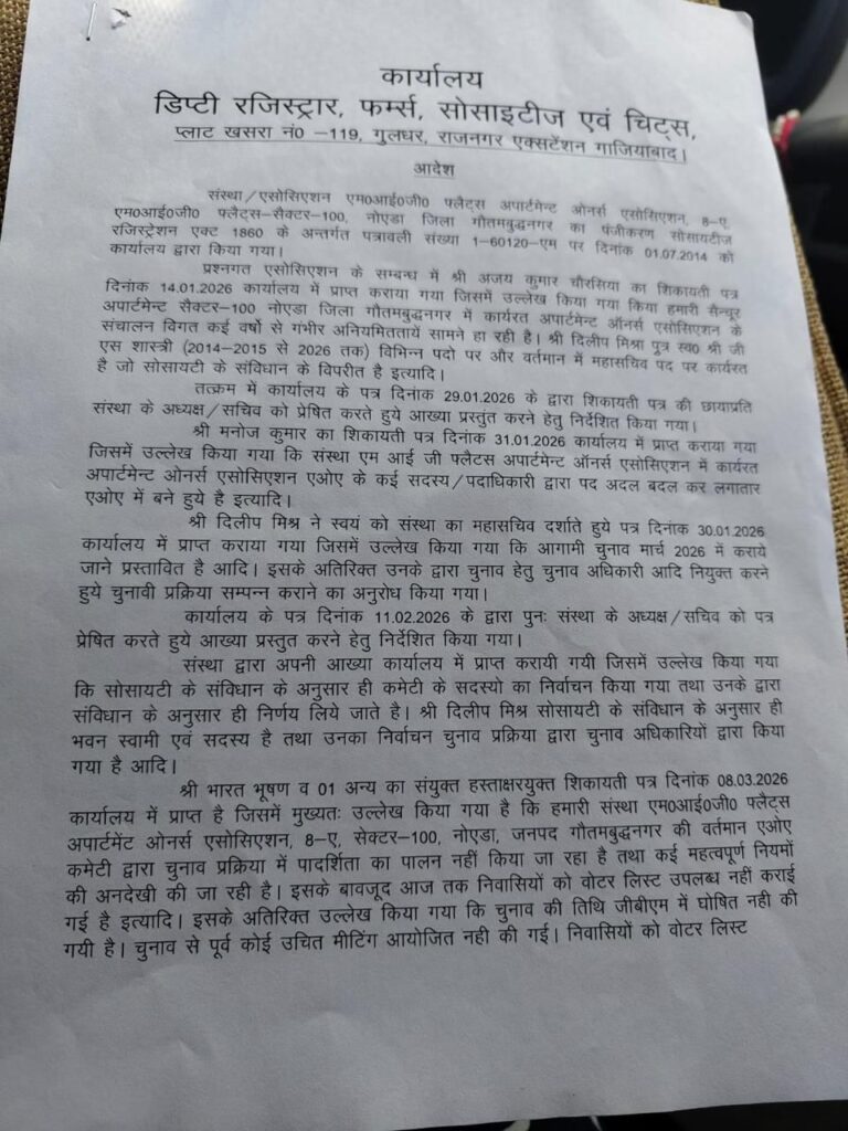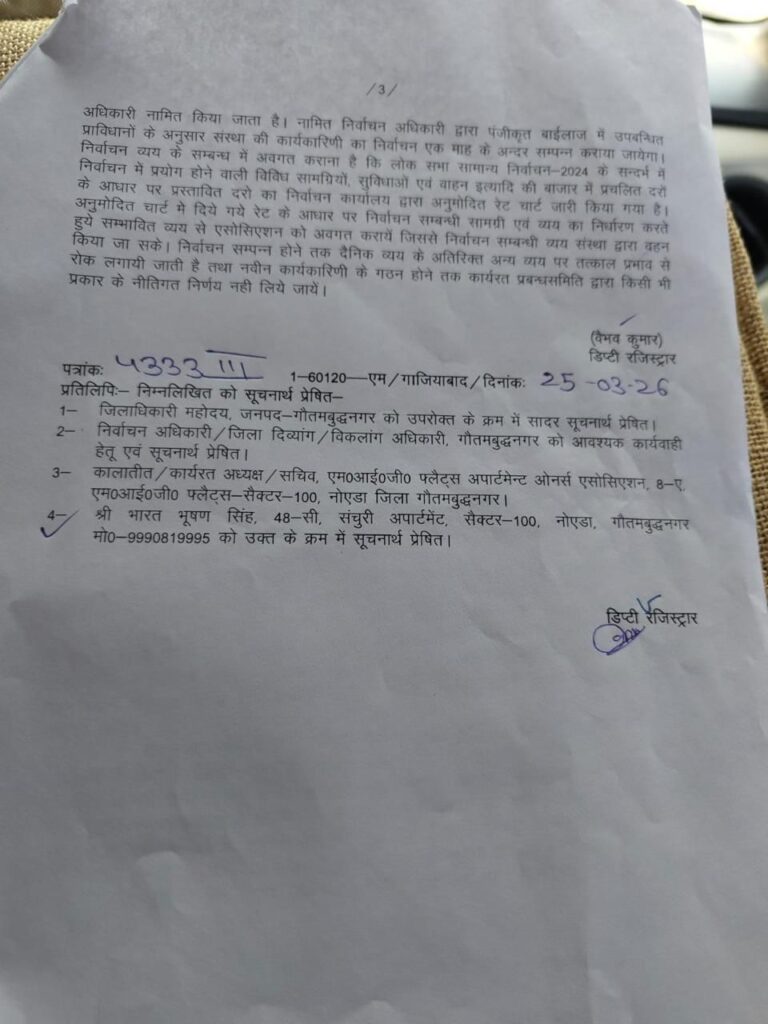 Noida : A dispute over the election process at Century Apartment, Sector 100, has intensified after the Office of the Deputy Registrar, Firms, Societies and Chits, Ghaziabad, directed that fresh elections be conducted within one month, even as the existing Apartment Owners Association (AOA) maintained that the process for the 2026 polls had already been initiated.