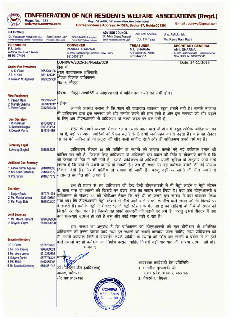 Noida : The Confederation of NCR Residents Welfare Associations (CONRWA) has strongly criticised the Noida Authority and the Delhi Metro Rail Corporation (DMRC) for what it calls a growing “race to encourage encroachment” in the city’s busiest commercial zones.