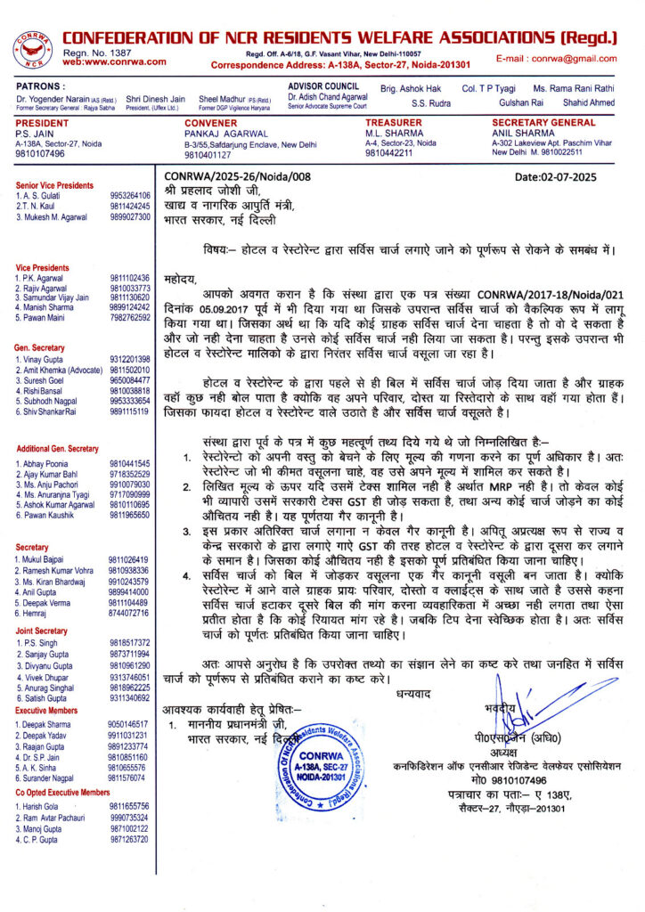 New Delhi/Noida: The Confederation of Residents Welfare Associations (CONRWA) has written to Prahlad Joshi, Union Minister of Consumer Affairs, Food and Public Distribution, demanding a complete ban on the practice of levying service charges by hotels and restaurants across the country.