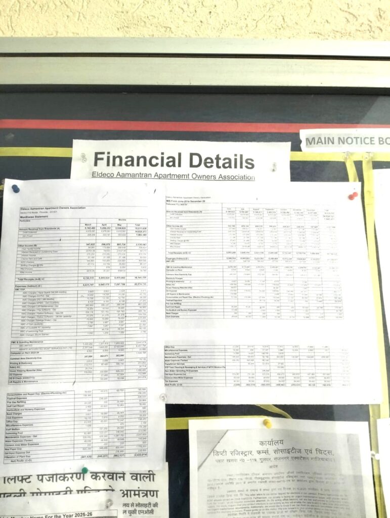 Eldeco Aamantran AOA displays monthly financial income, expenditure and FD details on tower notice boards, setting a transparency benchmark for housing societies in Noida.