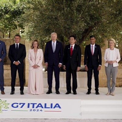 From left to right: US President Joe Biden, Italian Premier Giorgia Meloni, French President Emmanuel Macron, Canadian Prime Minister Justin Trudeau, German Chancellor Olaf Scholz, European Council President Charles Michel, and Japanese Prime Minister Fumio Kishida
