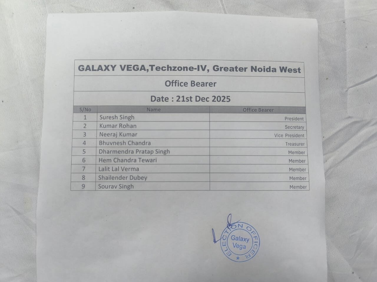Greater Noida West : The long-running dispute over the Apartment Owners’ Association (AoA) at Galaxy Vega, Greater Noida West, has finally culminated in the successful conduct of elections, bringing relief and a sense of closure to residents. The AoA elections were held peacefully and transparently on Sunday, December 21, 2025, marking a significant milestone after nearly a year of controversy and sustained resident-led efforts.