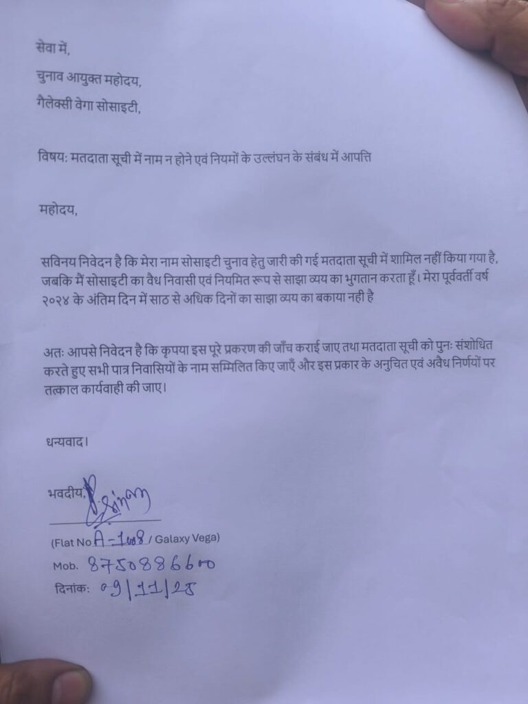 Several residents have pointed out that, despite making timely maintenance payments, their names have been unfairly removed from the voter list. Alleging a “systematic conspiracy”, the residents submitted a written complaint to the election officer demanding correction and restoration of voting rights.