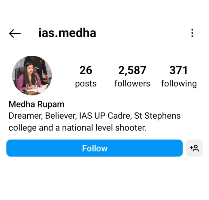 IAS Medha Rupam is ACEO in the Greater Noida Authority. Some miscreant has created a fake ID on Instagram using her name and photo.