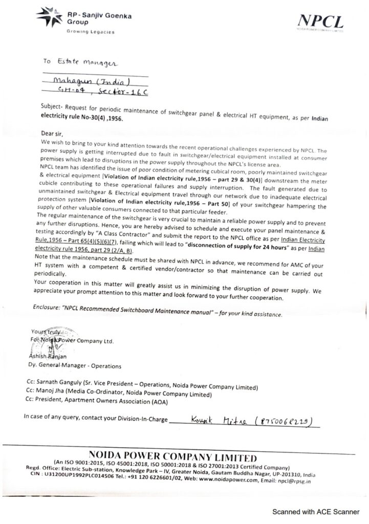 Taking action on the complaints of the residents regarding the electricity infrastructure, the NPCL team conducted an audit of the Mahagun Mywoods Society. To know the root cause of the electricity problem in the society, Kaushik Mitra of NPCL and his team repeatedly tried to find the root cause of the electricity problem by auditing the electrical infrastructure of the society. Many deficiencies were found in the audit due to which the fuse of the society would blow and the feeder of NPCL would also trip.