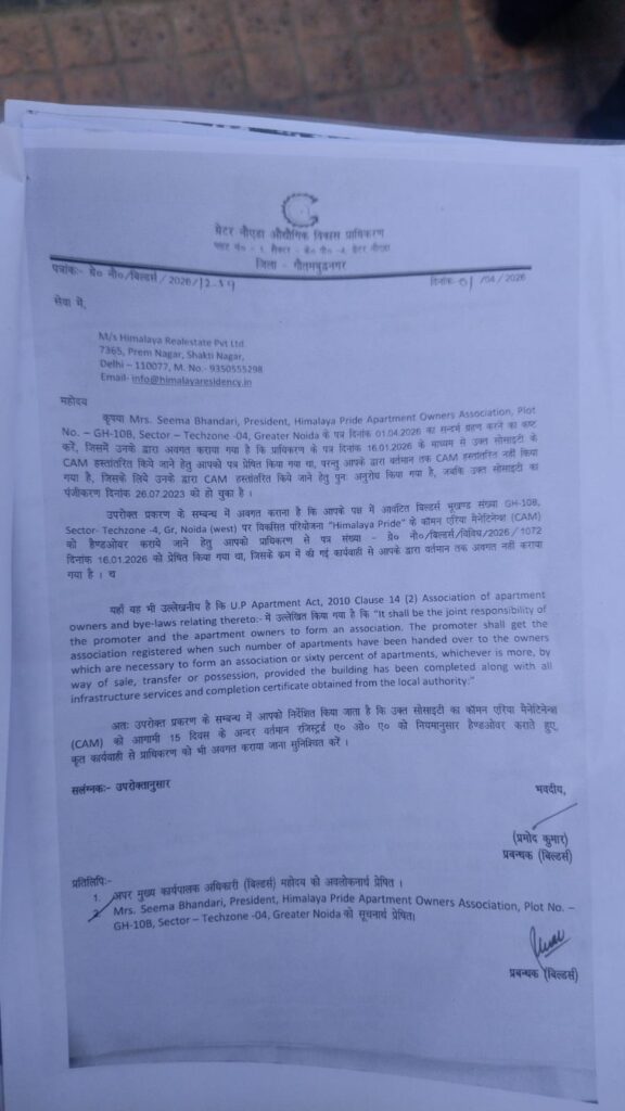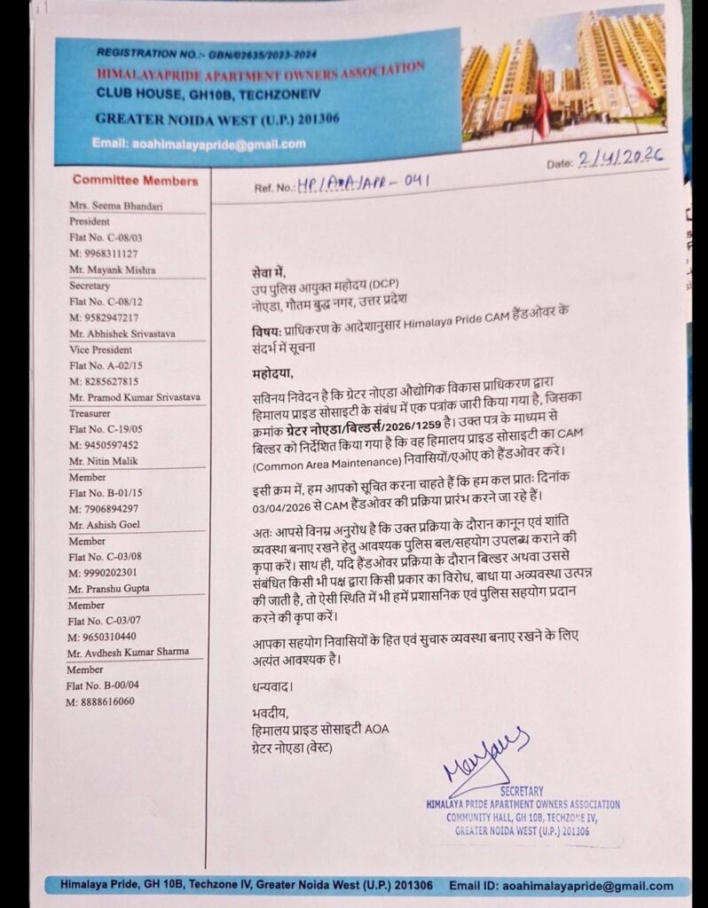 Greater Noida West : A fresh dispute has surfaced at Himalaya Pride Society in Greater Noida West during the ongoing handover process, with the Apartment Owners Association (AOA) alleging interference by the builder despite official directives from the authority.