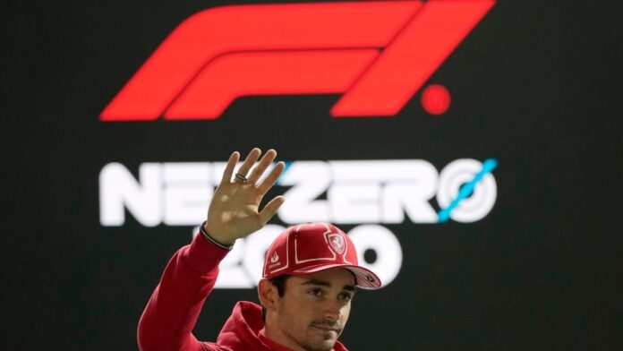 Ferrari driver Charles Leclerc, of Monaco, waves after winning the pole position during qualifications for the Formula One Las Vegas Grand Prix auto race, Saturday, Nov. 18, 2023, in Las Vegas. (AP Photo/John Locher)