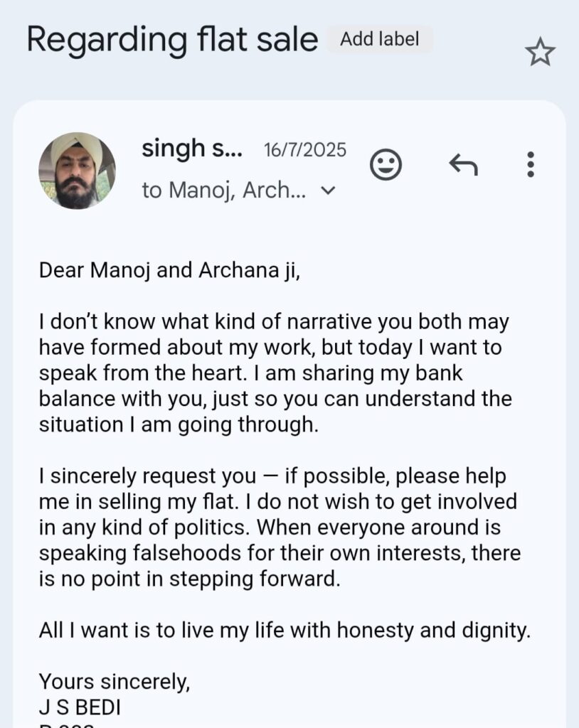 Dr J. S. Bedi, a lawful flat owner in the society and a medical practitioner with 27 years of professional experience, has stated that he has been facing continuous mental, financial and professional distress for nearly 16 years due to property-related complications and issues arising from the functioning of the Apartment Owners Association. He maintains that his intention is not to create confrontation but to seek transparency, lawful governance and protection of members’ rights.