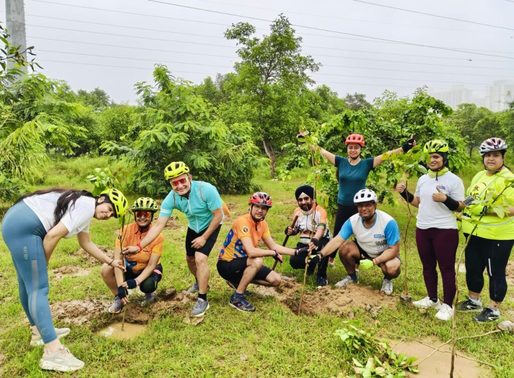 The event was jointly organised by SWAG (Super Women Athletic Group) and Noida Extension Cyclo Runners (NECR). The ride was not just about endurance—it was about responsibility. As part of the Go Green India initiative, the group stopped at Khairpur village, Noida West, to join Think Good Foundation led by Amit Bhatnagar in his mission “100 Crore Trees”.