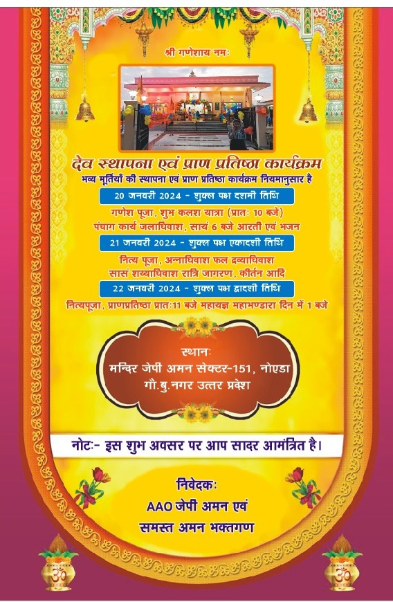 On January 20th, the Program will start at 10 am with the Ganesh Poojan followed by a grand Kalash yatra, in which the women will wear yellow and orange saris, and suits and will keep a Kalash on their heads, will take a round of whole society.