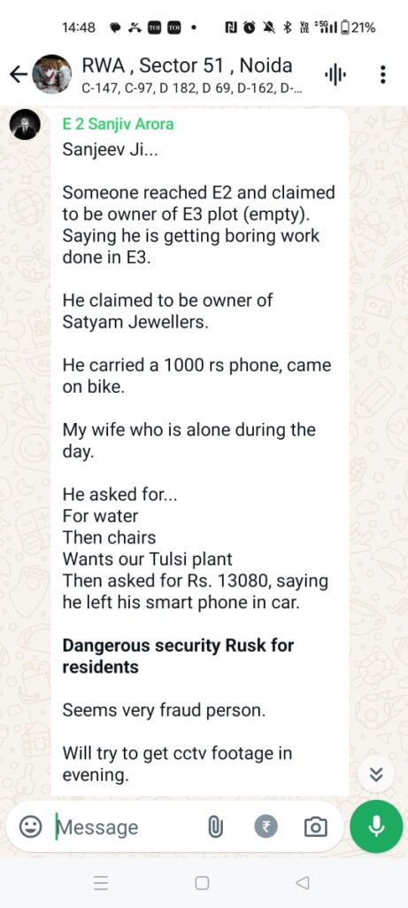 The family living in E-2, Sector 51 has reported this incident to the General Secretary of Sector 51’s WhatsApp group and has requested help.