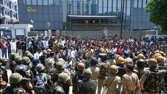 Dushyant Rustagi, a factory owner in Sector 63, said a group of protesters forced their way into the factory premises after repeatedly pushing the unit’s gate. “I was monitoring the CCTV when a group gathered outside and broke open the gate. They entered the premises, and I rushed downstairs to intervene. While trying to push them out towards the gate, I was attacked and sustained minor injuries. Stones were also thrown during the incident,” he said.