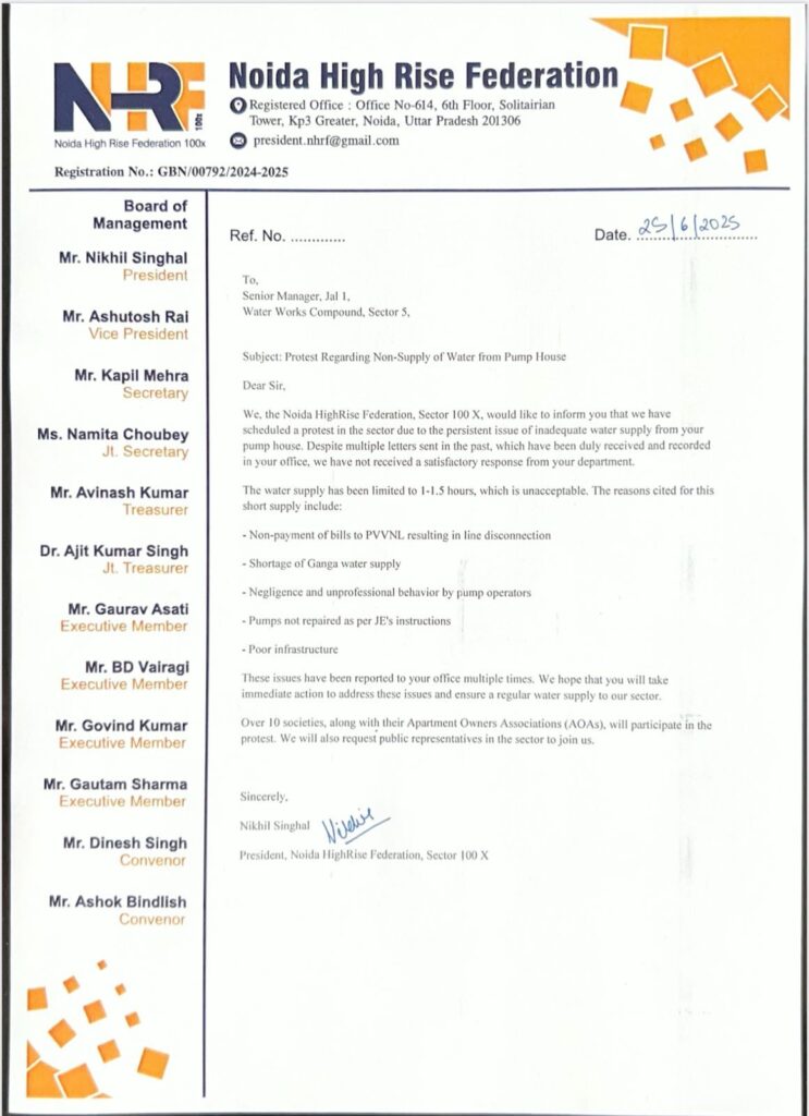 The announcement that Ganga water will no longer be supplied is a major blow to high-rise societies in Noida. We are already facing severe shortages, and this decision will deepen the crisis. We urge the authorities to urgently review this policy and restore regular water supply.
