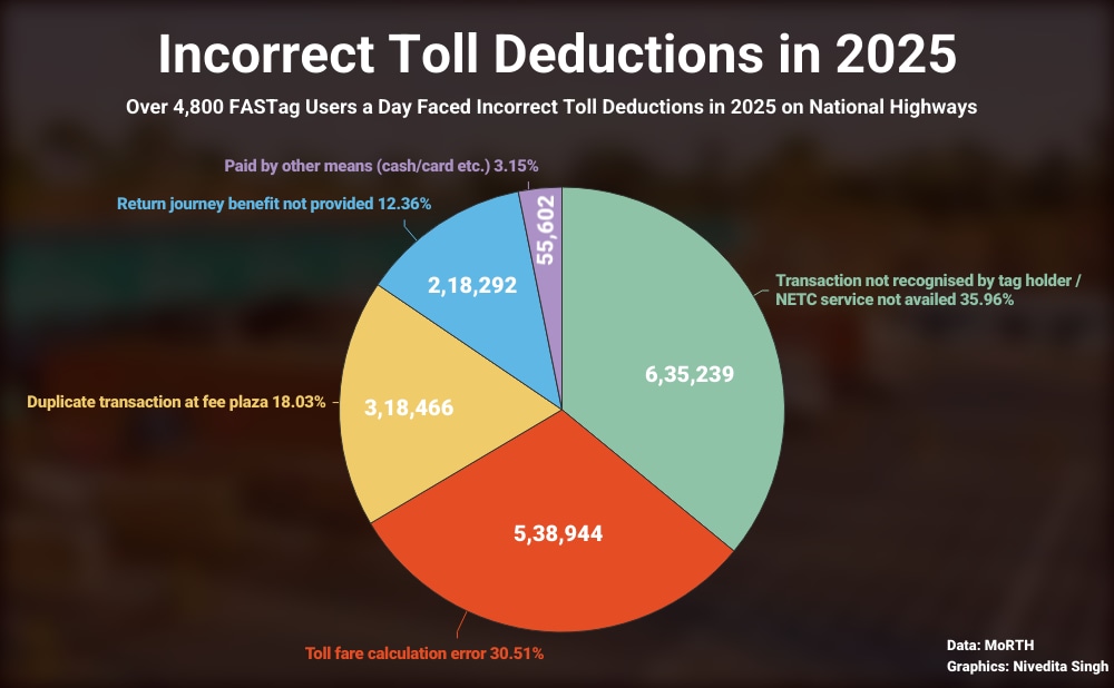 The Ministry of Road Transport and Highways (MoRTH) this week informed the Lok Sabha that the National Payment Corporation of India (NPCI), which provides the Central Clearing House (CCH) services of the National Electronic Toll Collection (NETC) Programme, has reported 17.66 lakh transactions where refunds were made due to incorrect user fee (toll) deductions between January and December 2025.