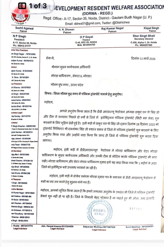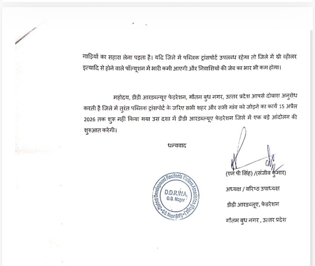Noida: The DDRWA Federation of Gautam Buddh Nagar has once again urged the authorities to immediately start public transport services in the district, stating that residents have been facing severe inconvenience due to the absence of a reliable city bus system.