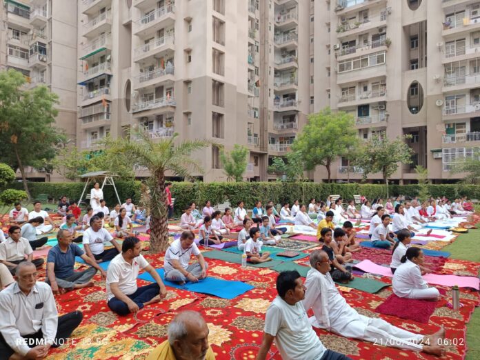 Yoga, More than 450 people from the society and nearby performed yoga asanas at different times. The main organizer of the event and the secretary of the society, Subodh Tyagi, says, “Yogacharya Vishal Vashishth and Nivedita Jain, who came from Haridwar’s Patanjali Ashram, explained the importance of yoga in a very simple and systematic way and called for adopting it in their daily routine.”