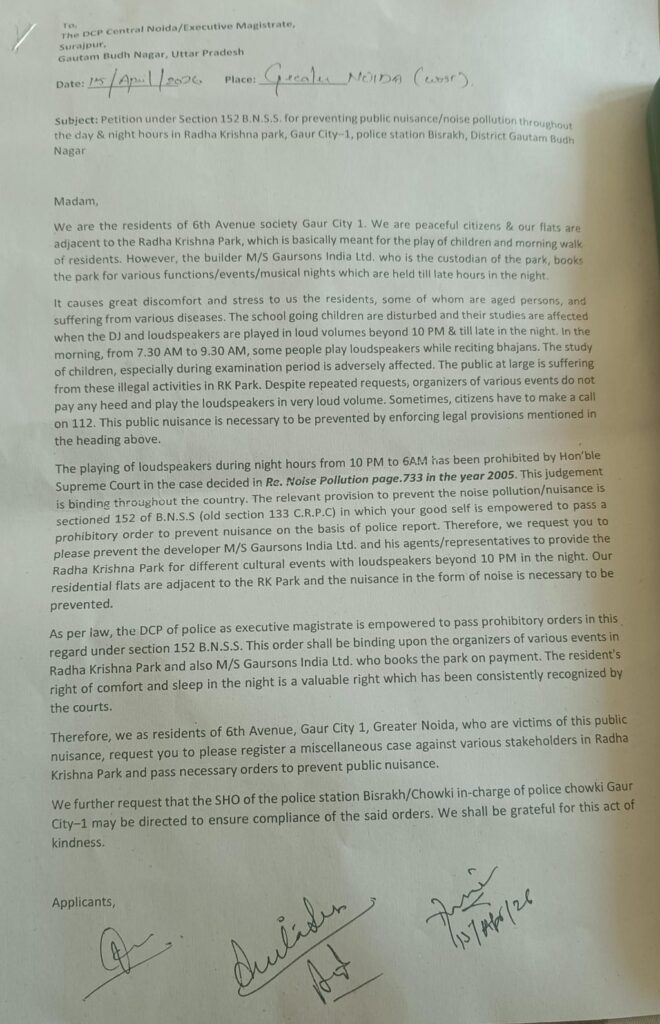 Residents of Gaur City 1 escalate protest over late-night noise at Radha Krishna Park. Despite repeated complaints, loudspeakers continue past midnight, violating norms and disturbing families. Over 70 petitions submitted to police, demanding strict action.