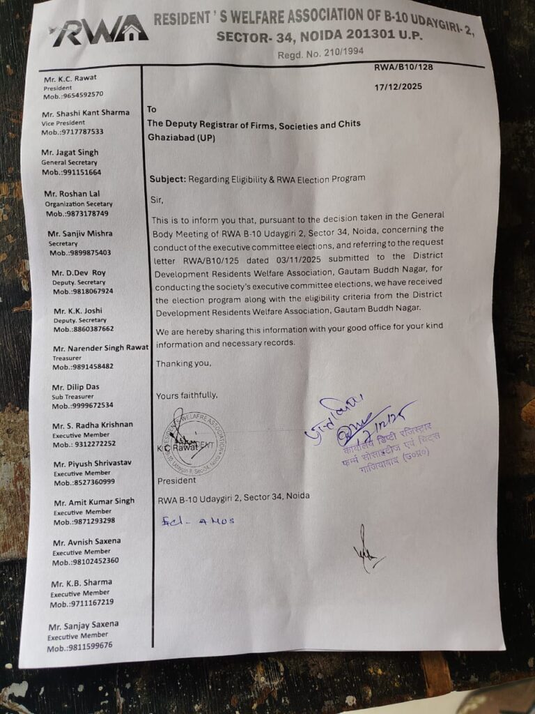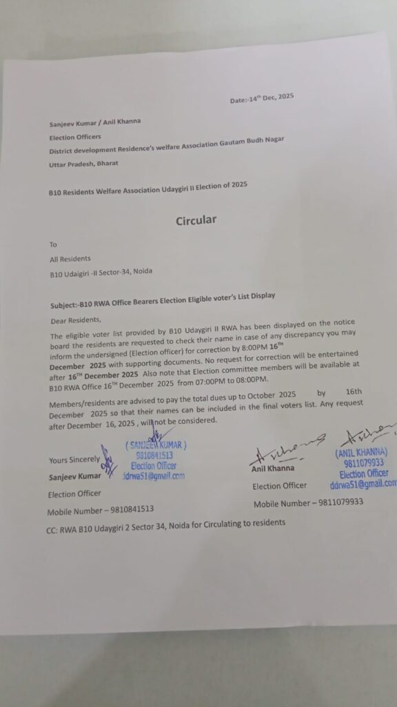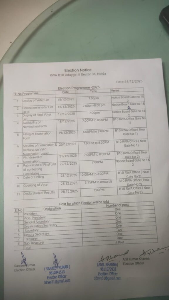 Noida: The election process for the Resident Welfare Association (RWA) of Udaygiri-2, B-10, Sector-34, Noida has formally commenced. The DDRWA Federation has appointed Sanjeev Kumar, Senior Vice President and Anil Khanna, Vice President, as Election Officers to oversee the entire process.
