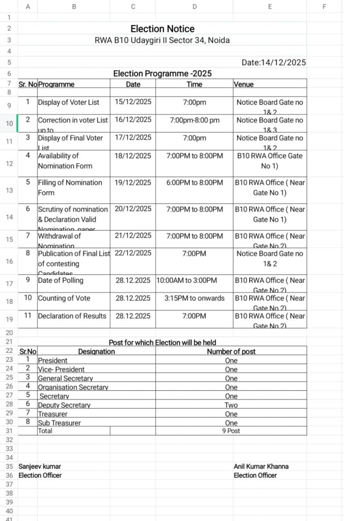 Election Officers Sanjeev Kumar and Anil Khanna have appealed to all residents to cooperate with the election process and participate actively to ensure a transparent and fair election for the B-10, Udaygiri-2 RWA executive committee.