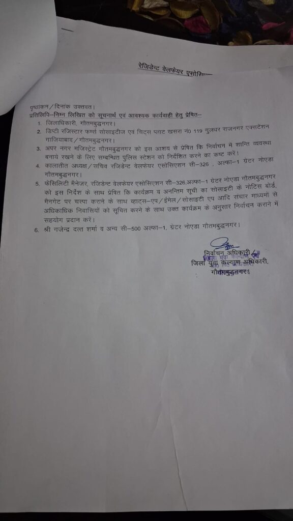 Greater Noida : Residents of Sector Alpha-1 have been officially informed about the upcoming Resident Welfare Association elections. The announcement was made on February 22, 2026. RWA Election Officer Mahipal Singh and his team have confirmed that the elections in Sector Alpha-1 will be conducted on March 15, 2026. Necessary formalities regarding the election process have been completed.
