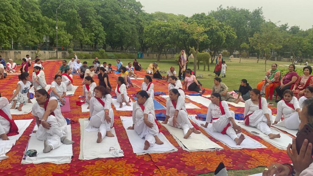 Noida: International Yoga Day was celebrated with great enthusiasm today under the aegis of Bharatiya Yoga Sansthan and Rashtriya Swayamsevak Sangh. Various yoga asanas and pranayama were conducted under the supervision of Seema Garg and Lalita Chauhan, founders of Bharatiya Yoga Sansthan in Sector 122, which is useful for BP, sugar, thyroid, memory and overall health. There are 908 asanas in yoga and 50 were practised today where almost 100 members of the sector participated in the practised Yoga. Brajesh Shukla also conducted various useful asanas.