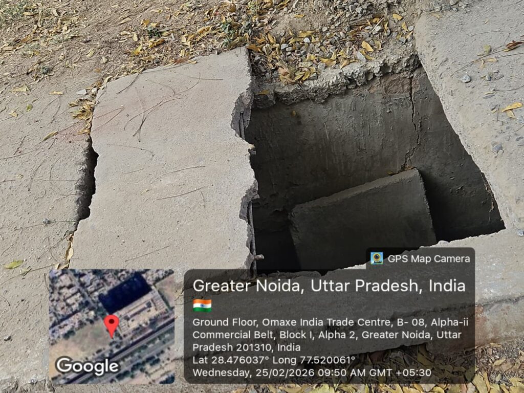 Noida: Residents of Sector Alpha 2 have raised serious concerns over deteriorating civic infrastructure, alleging that broken drain slabs and damaged signboards have turned several internal roads into potential accident zones.