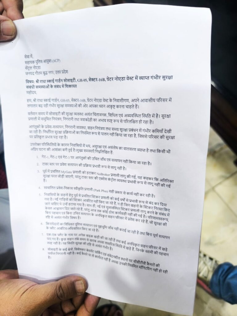 Greater Noida West: In a fresh escalation of residents’ grievances, homebuyers of Radha Sky Garden, GH-05, Sector 16B, have formally submitted a written complaint to the Assistant Commissioner of Police (ACP), Central Noida, flagging what they describe as “serious and persistent security lapses” within the society premises.