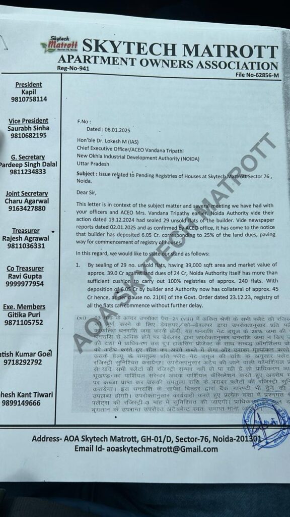 Noida: The members of AOA Skytech Matrott on January 6, 2025, handed over the demand letter to ACEO Vandana Tripathi for a smooth registration process. ACEO said that she does not know the buyers and registration will be done as per the list given by the builder.