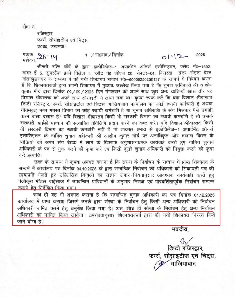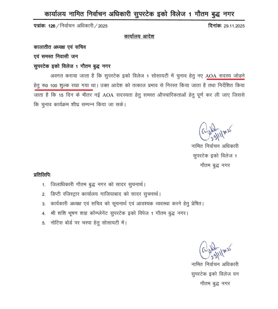 Greater Noida West: The political atmosphere inside Supertech Ecovillage-1 has finally delivered its biggest twist, the election officer appointed for the AOA elections will now be replaced. A decision triggered not by rules or regulations, but by what residents call “the mysterious entry of middlemen and a series of silent meetings.
