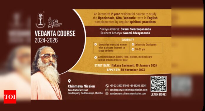 Chinmaya Mission is thrilled to invite unmarried men and women, aged 20-35, with undergraduate degrees to embark on a transformative journey of self-discovery and spiritual enlightenment.Commencing on Makara Sankranti, January 15, 2024, this intensive two-year residential course offers a unique opportunity to explore the profound teachings of Vedanta – the Upanishads, Bhagavad Gita, Brahma Sutra, Srimad Bhagavatam and other treatises of Hindu philosophy, all presented in English. Sanskrit and Vedic chanting will also be taught during the Course.